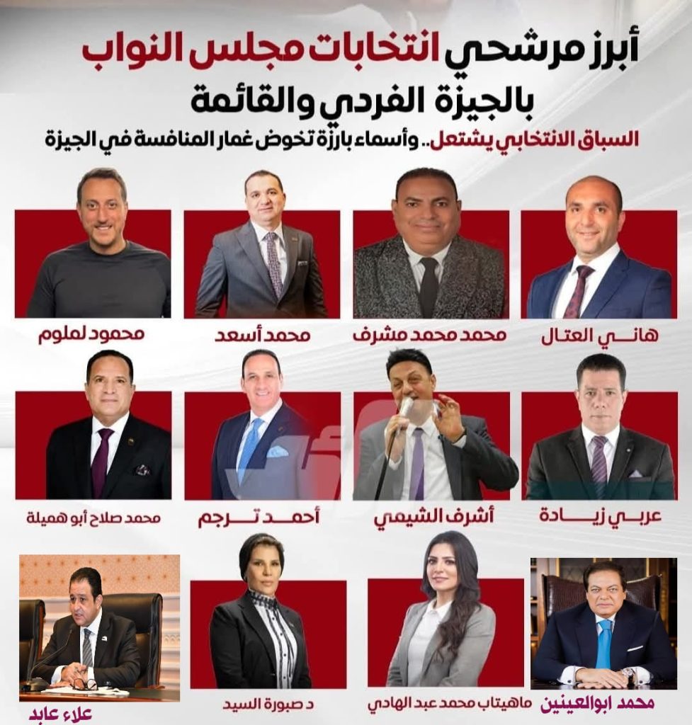 ومن ابرز الأسماء المرشحة في الأحزاب على القائمة والفردي بمحافظة الجيزة هم النائب علاء عابد واللواء محمد صلاح ابو هميلة والنائب عبدالوهاب خليل والنائب محمد ابو العينين وعلى المقاعد الفردية كلا من المستشار عربي زيادة عن حزب حماة الوطن على مقعد مركز الصف وأحمد ترجم عن حزب حماة الوطن عن مقعد اكتوبر ومحمد أسعد وهاني العتال ومحمد محمد مشرف ومحمود لملوم وأشرف الشيمي ود صبورة السيد وماهيتاب محمد عبدالهادي .