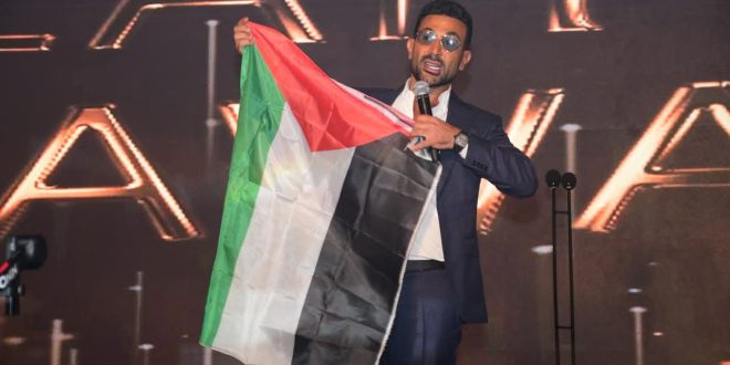 حرص الفنان أحمد سعد علي رفع علم فلسطين خلال تكريمة دعم منه للقضية الفلسطينية و حصلت هذا اللافته علي اعجاب الحضور و الجمهور