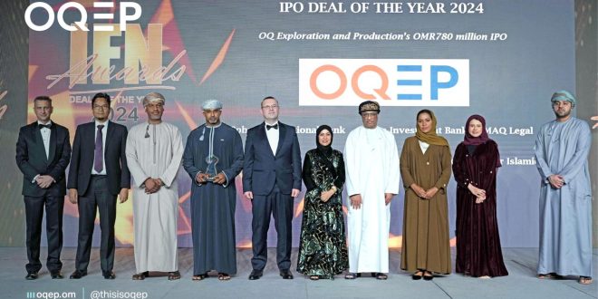 وتعليقاً على ذلك، أعرب أحمد بن سعيد الأزكوي الرئيس التنفيذي لشركة أوكيو للاستكشاف والانتاج عن سعادته بحصول الشركة على هذه جائزة صفقة الطرح لعام 2024، المتوافق مع الشريعة الاسلامية، والذي بلغت قيمته 780 مليون ريال عماني، مشيرا إلى التزام الشركة بفرص الاستثمار المتوافقة مع الشريعة الإسلامية في قطاع النفط والغاز. وأكد الأزكوي أن هذه الجائزة تمثل إنجازا هاما لشركة أوكيو للاستكشاف والإنتاج حيث تهدف الشركة إلى تحقيق تدفقات نقدية قوية وتوسيع أصولها وهي عوامل تعد أساسية لتحقيق نمو مستدام معرباً عن شكره للمستثمرين على ثقتهم وتقديره للبنوك التي ساهمت في إنجاح الاكتتاب.