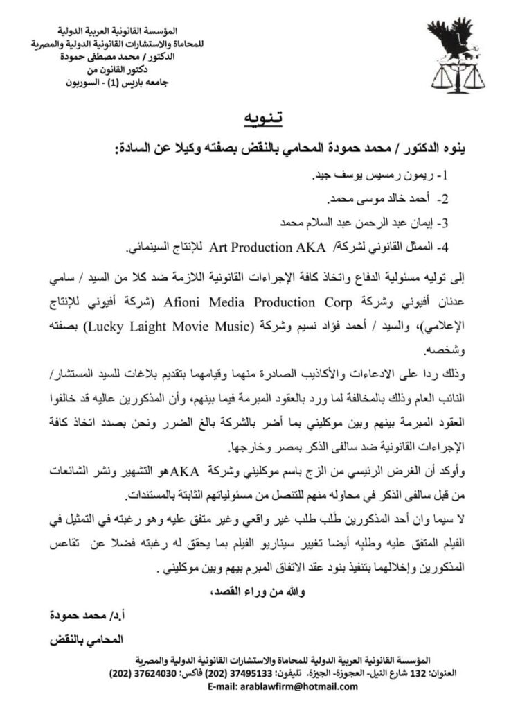 تؤكد شركة “AKA ريمون رمسيس وأحمد خالد موسى” إتخاذ كافة الإجراءات القانونية ضد السيد سامي عدنان أفيوني، بسبب الإدعاءات الكاذبة والاتهامات الباطلة التي أطلقها مؤخراً عبر وسائل الإعلام، والتشهير بالشركة وكذلك ضد المنتج رانى مسحال منتج فيلم “تماسيح النيل” بسبب التشهير والإتهام الباطل فى أزمة ملابس الفنانة هنادى مهنا خلال الفيلم.