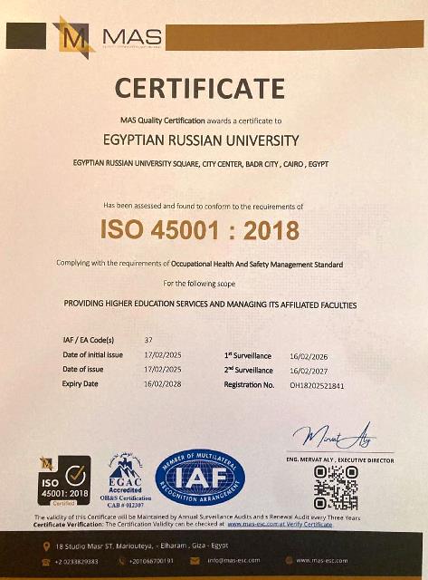 الجامعة المصرية الروسية تحصل على شهادتى الأيزو 14001 و45001