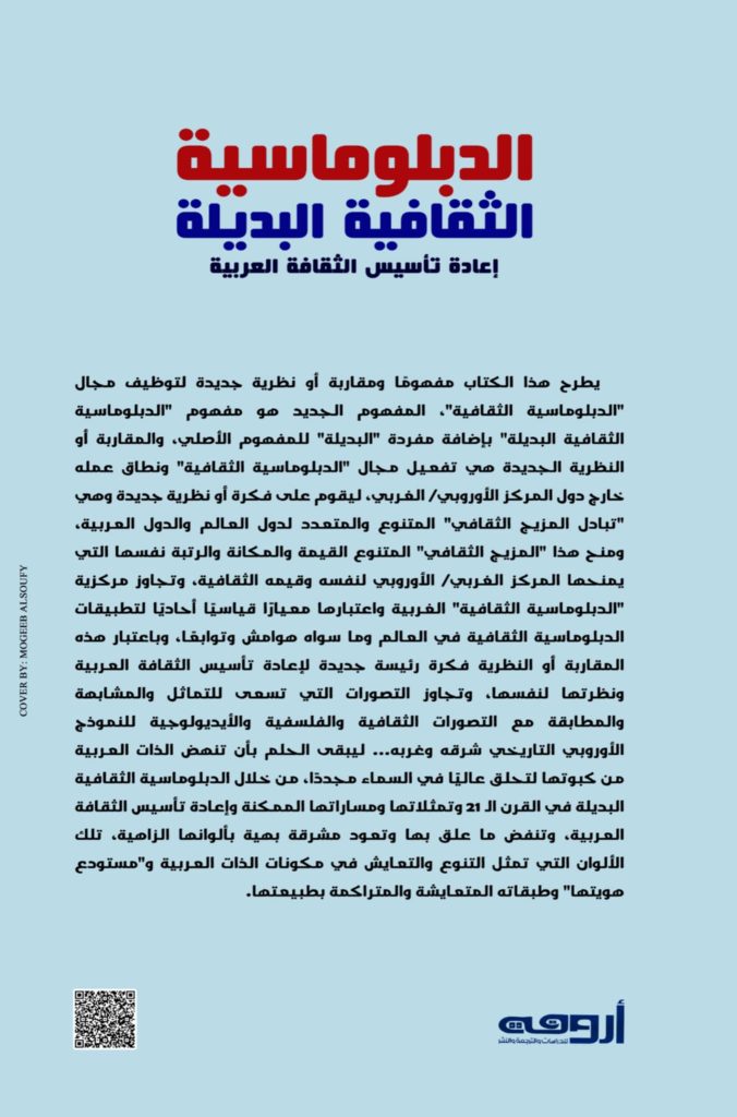 يطرح الكتاب مفهوما ومقاربة أو نظرية جديدة لتوظيف مجال “الدبلوماسية الثقافية”، المفهوم الجديد هو مفهوم “الدبلوماسية الثقافية البديلة” بإضافة مفردة “البديلة” للمفهوم الأصلي، والمقاربة أو النظرية الجديدة هي تفعيل مجال “الدبلوماسية الثقافية” ونطاق عمله خارج دول المركز الأوربي/ الغربي، ليقوم على فكرة أو نظرية جديدة وهي “تبادل المزيج الثقافي” المتنوع والمتعدد لدول العالم والدول العربية، ومنح هذا “المزيج الثقافي” المتنوع القيمة والمكانة والرتبة نفسها التي يمنحها المركز الغربي/ الأوربي لنفسه وقيمه الثقافية، وتجاوز مركزية “الدبلوماسية الثقافية” الغربية واعتبارها معيارا قياسيا أحاديا لتطبيقات الدبلوماسية الثقافية في العالم وما سواه هوامش وتوابعا، وباعتبار هذه المقاربة أو النظرية فكرة رئيسة جديدة لإعادة تأسيس الثقافة العربية ونظرتها لنفسها، وتجاوز التصورات التي تسعى للتماثل والمشابهة والمطابقة مع التصورات الثقافية والفلسفية والأيديولوجية للنموذج الأوربي التاريخي شرقه وغربه.