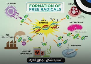 عندما نحصل على الغذاء عن طريق الجهاز الهضمي ويتم الهضم والامتصاص ويصل الغذاء الممتص إلى الخلايا عن طريق الدم وفي وجود الاكسجين الذي نحصل عليه عن طريق الجهاز التنفسي يتم حرق الغذاء الممتص داخل الخلايا للحصول على الطاقة اللازمة لقيام الجسم بالأنشطة المختلفة، ولكن بعد هذه العملية الحيوية يتم أنتاج ذرات تحتوي على واحد أو أكثر من الإلكترونات غير المزدوجة والتي يطلق عليها الشّوارد الحُرّة أو الجذور الحرة (Free Radicals). وبالتالي فأنه يتم إنتاج الجذور الحرة عن طريق العمليات الحيوية التي تحدث باستمرار داخل خلايا الجسم، أو تكون عن طريق مسببات خارجية مثل التلوث، التدخين، الاشعاع أو التعرض للمواد الكيميائية مثل المبيدات الحشرية وكذلك ادمان الكحول والضغوط النفسية والتقدم في العمر.