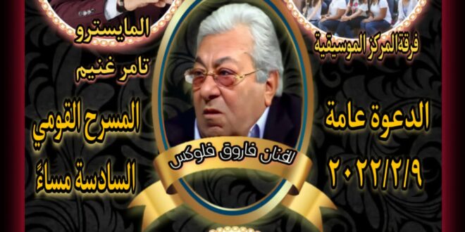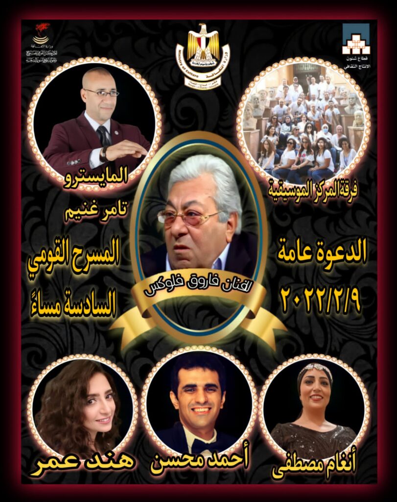 برعاية وحضور وزيرة الثقافة الأستاذة الدكتورة إيناس عبد الدايم، وبإشراف رئيس قطاع شئون الإنتاج الثقافي المخرج الكبير خالد جلال؛ يقيم المركز القومي للمسرح والموسيقى والفنون الشعبية برئاسة الفنان القدير ياسر صادق؛ احتفالية كبرى لتكريم الفنان الكبير فاروق فلوكس، تقديم: الإعلامية المتميزة بسنت بكر، وذلك في السادسة مساء اليوم الأربعاء ٩ فبراير ٢٠٢٢م، بالمسرح القومي.