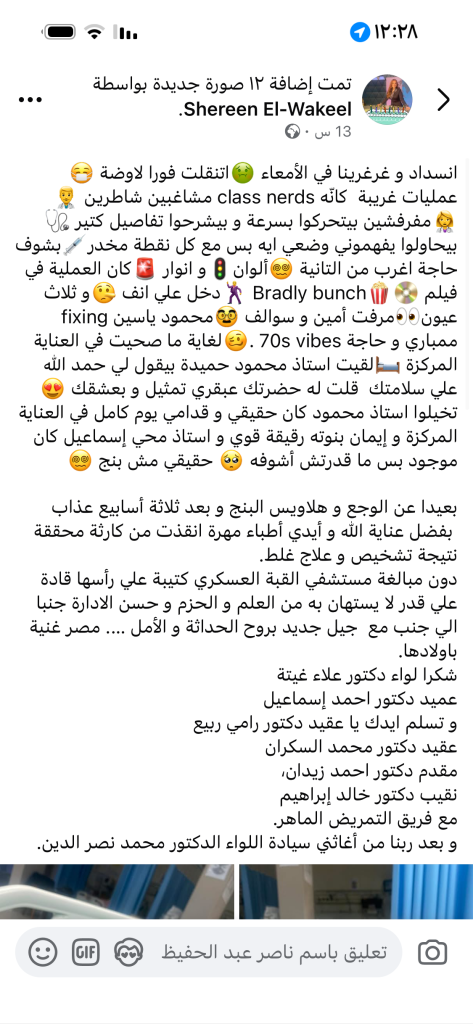 ثلاثة أسابيع عذاب تُختصر في جملة واحدة، ثم ينفتح النص على شكر واضح، محدد بالأسماء والرتب، للأطباء والتمريض والإدارة.