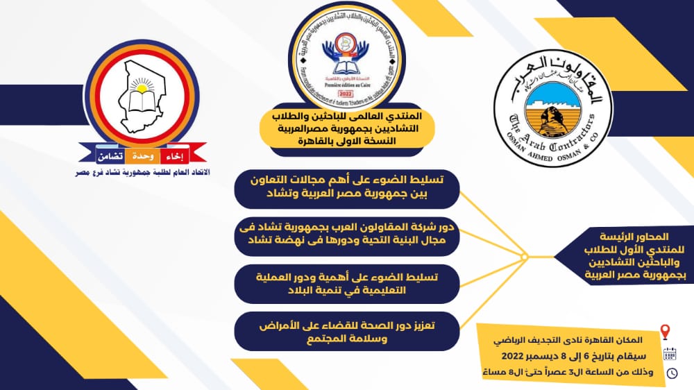 أتحاد طلاب تشاد بمصر، ينظم المنتدى العالمي للباحثين والطلاب التشاديين بنادى المقاولون العرب للتجديف بالدقي، غدًا الثلاثاء والاربعاء، تحت عنوان” العلاقات المصرية التشادية”، ويعد لأول مرة ينعقد علي أرض الكنانة.