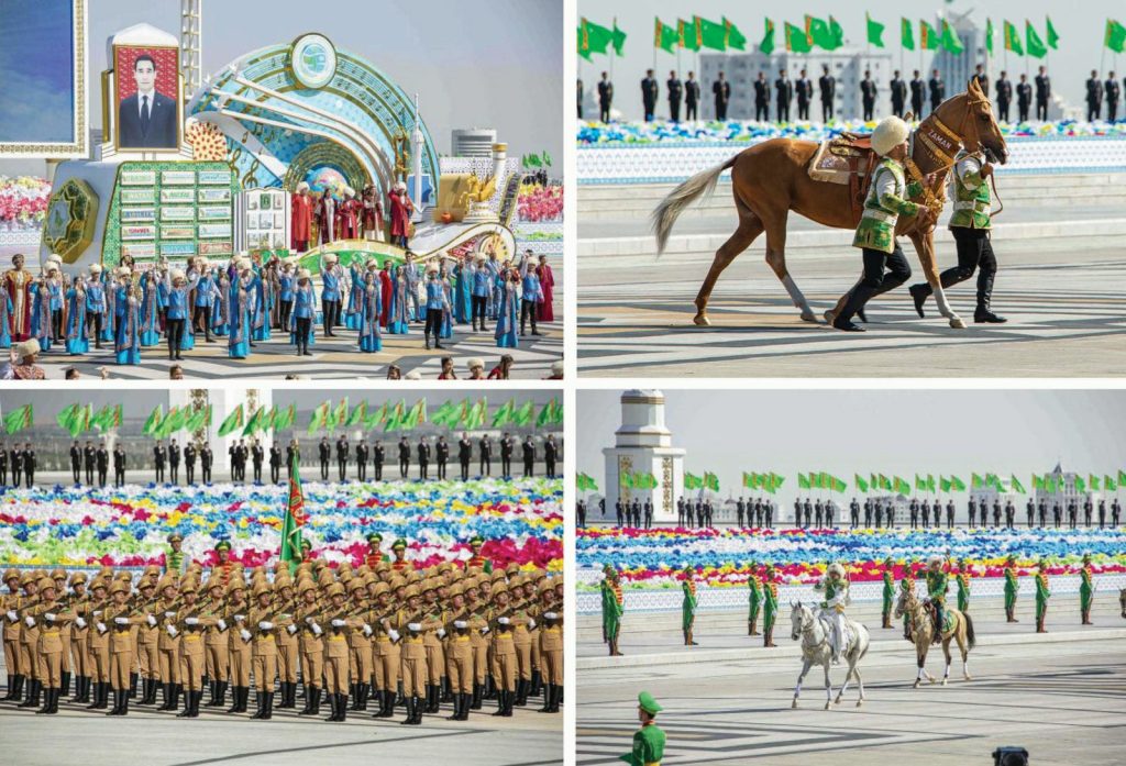 ومن المشاهد الملفتة للنظر هو اصطحاب فارسان يرتديان الزي الوطني حصانًا رائعًا من نوع “أخال تيكي” ذو المكانة التاريخية والتراثية لدى التركمان إلى الساحة، ثم انطلقت مواكب السيارات المزينة بأسلوب احتفالي، كاشفةً عن إنجازات ونجاحات مختلف قطاعات الاقتصاد الوطني في بلدنا، واحدة تلو الأخرى، وكان هذا الموكب المهيب دليلاً آخر على إنجازات تركمانستان الاقتصادية والتنموية والاجتماعية.