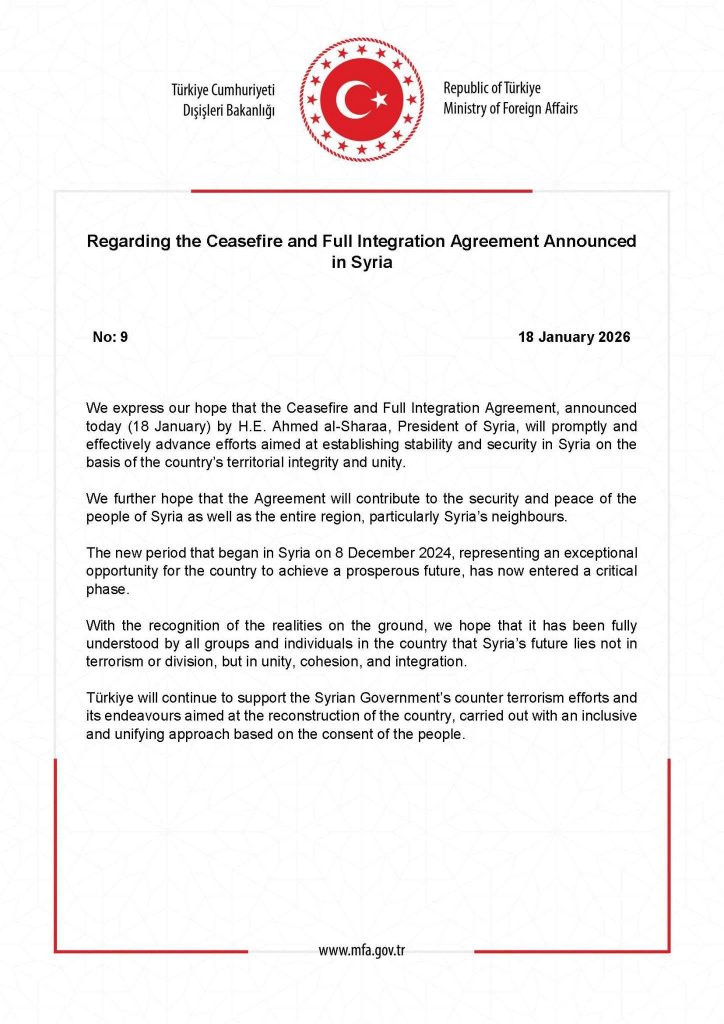 رحبت وزارة الخارجية التركية بإعلان رئيس سوريا، أحمد الشريعة، اليوم عن اتفاق وقف إطلاق النار والتكامل الكامل، معتبرة أنه خطوة حاسمة لتعزيز الاستقرار والأمن في سوريا على أساس وحدة وسلامة أراضيها.