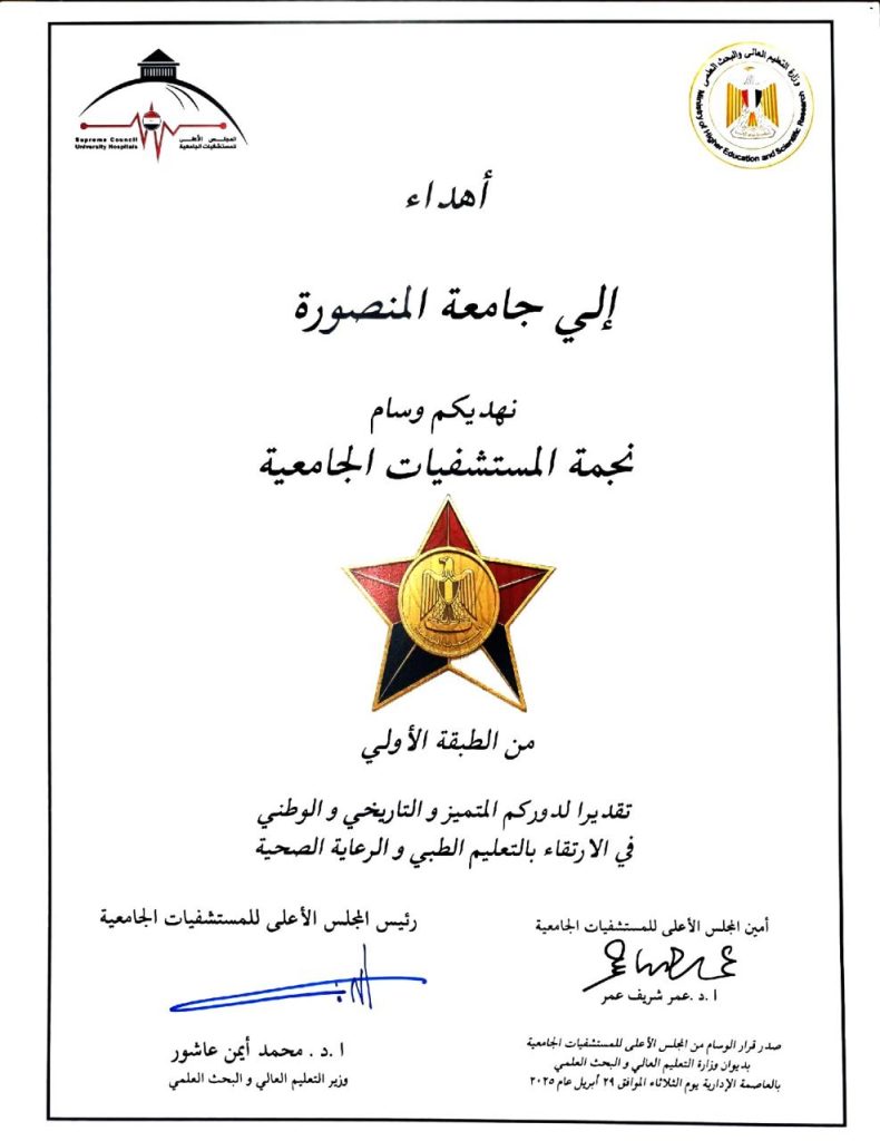 ويُمثِّل حصول مستشفيات جامعة المنصورة على درع “نجمة المستشفيات الجامعية” تتويجًا مستحقًّا لجهودٍ متواصلة وشهادةَ ثقةٍ في قدراتها المؤسسية ورسالةً واضحةً بأن الاستثمار في التعليم الطبي المتطور والخدمة الصحية الشاملة هو السبيل إلى الريادة في القطاع الصحي الجامعي بمصر.