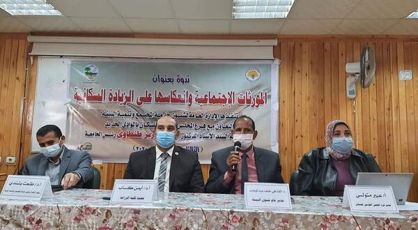 برعاية الأستاذ الدكتور عبد العزيز طنطاوي رئيس جامعة الوادي الجديد، وفي إطار الخطة السكانية للجامعة نفذت الإدارة العامة لشئون خدمة المجتمع وتنمية البيئة بالجامعة، بالتعاون مع فرع المجلس القومي للسكان ندوه بعنوان (الموروثات الاجتماعية وانعكاسها علي الزيادة السكانية).