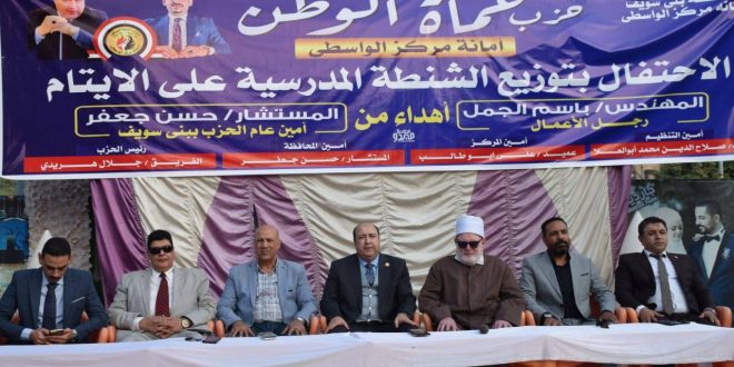 نظم حزب حماة الوطن ببني سويف، برئاسة المستشار حسن جعفر، الأمين العام للحزب بالمحافظة، أمانة مركز الواسطي ، حفل توزيع المستلزمات المدرسية على الأيتام ، حيث يأتي هذا النشاط كجزء من جهود الأمانة المستمرة لدعم الفئات البسيطة وضمان كرامة أسرة اليتيم ، في إطار تعزيز قيم التكافل والتضامن.
