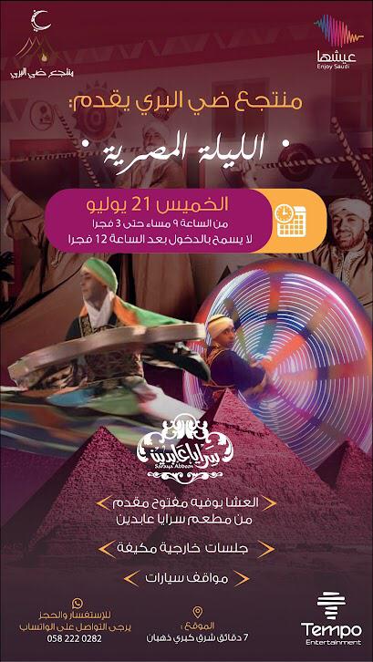 ضمن الأنشطة والبرامج والمبادرات التي يتم تنظيمها بهدف التنشيط السياحي في وطننا الحبيب المملكة العربية السعودية – يقيم منتجع ضي البري فعالية( الليلة المصرية)بحضور عازفين وفرق فلكلورية مصرية، حيث سيستمتع الزوار بالأجواء والضيافة والطعام المصري في ليلة ثرية بالترفيه والتي تختصر مسافة السفر إلى دولة مصر الشقيقة وتجعل الزائر يعيش تجربة تلك الأجواء دون عناء السفر