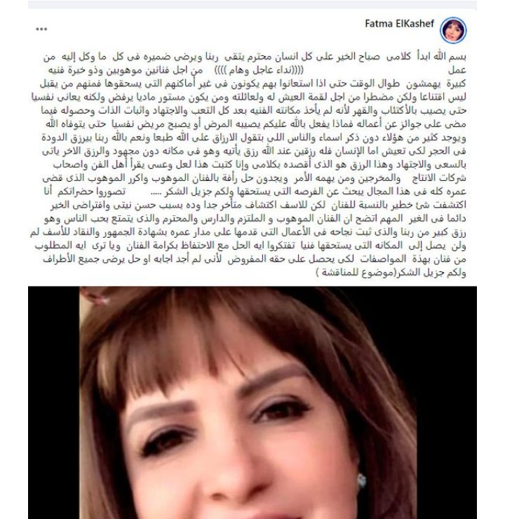 وأردفت الفنانة “فاطمة الكاشف”قائلة:”وهذا الرزق هو الذى أقصده بكلامى وإنا كتبت هذا لعل وعسى يقرأ أهل الفن واصحاب شركات الانتاج والمخرجين ومن يهمه الأمر ويجدون حل رأفة بالفنان الموهوب واكرر الموهوب الذى قضى عمره كله فى هذا المجال يبحث عن الفرصه التى يستحقها ولكم جزيل الشكر “.
