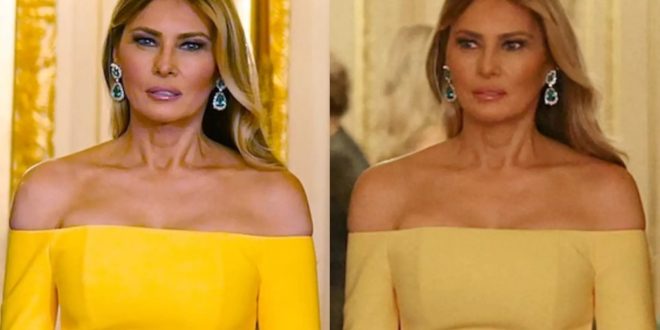 وخلال مأدبة عشاء أقامتها العائلة المالكة في قلعة وندسور مساء أمس الأربعاء، ظهرت ميلانيا بفستان من تصميم كارولينا هيريرا بدا بألوان متباينة في الصور المنتشرة عبر الإنترنت، بحسب ماعت جروب، ففي بعض اللقطات ظهر الفستان أصفر لامعًا بحزام بنفسجي، بينما بدا في صور أخرى أصفر كريميًا بحزام وردي فاتح.
