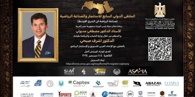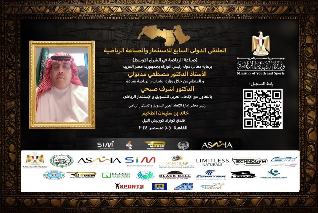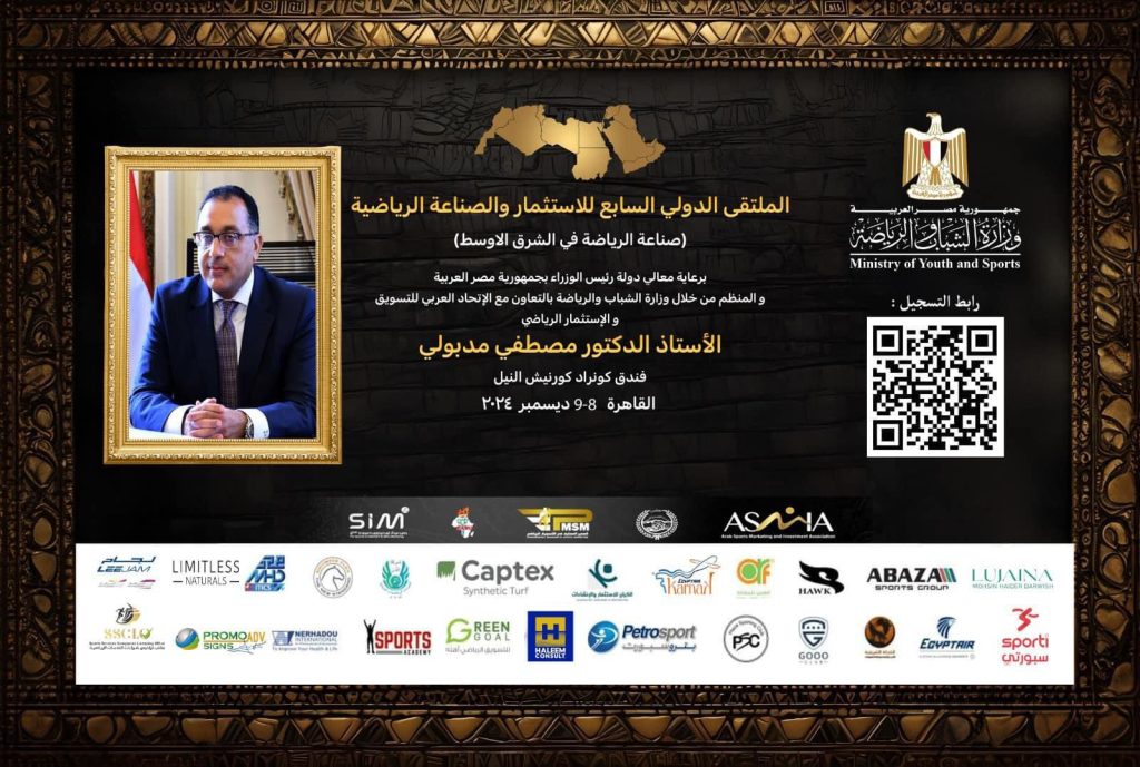 فى اطار الاستعداد لاستضافة مصر للنسخة السابعة من الملتقى الدولي للاستثمار والصناعة الرياضية ولأول مرة يكون هذا الحدث برعاية دولة رءيس مجلس وزراء مصر الاستاد الدكتور مصطفى مدبوليحيث ينظمة الاتحاد العربي للتسويق والاستثمار الرياضى للعام السابع على التوالى بالتعاون مع وزارة الشباب والرياضة المصرية بمشاركة عشرات الشركات والكيانات والمؤسسات والمصانع العالمية والعربية والمصرية المتخصصة فى مجال الصناعة والتصنيع والتسويق والترويج والاستثمار الرياضى