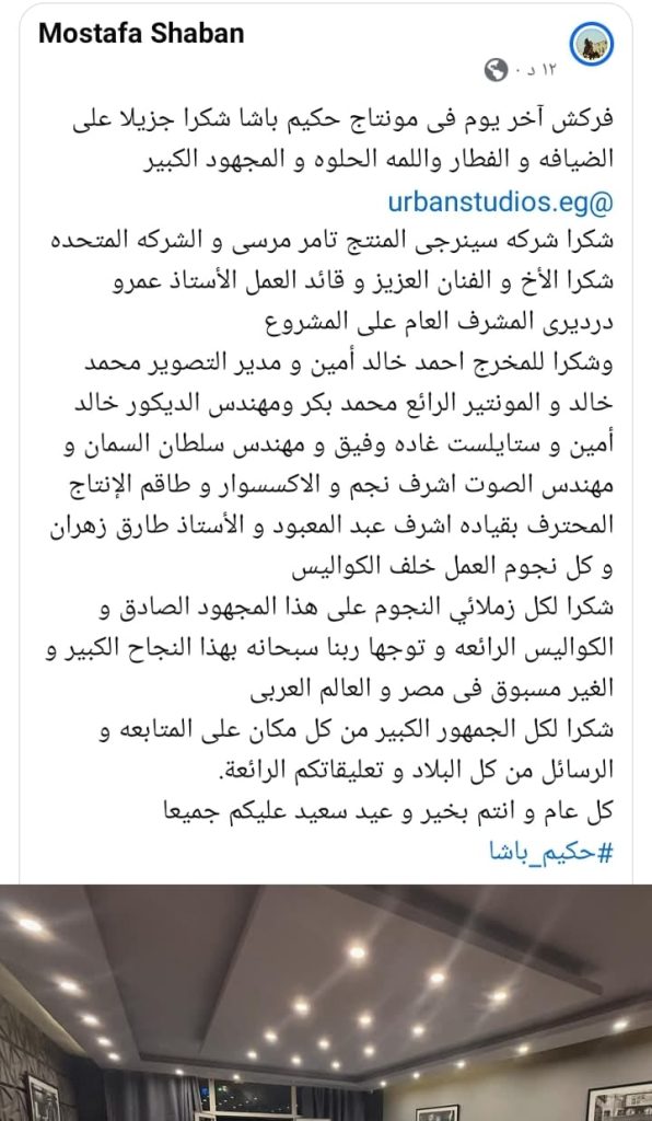 وأعرب النجم السوبر ستار مصطفى شعبان عن سعادته البالغة بالتعاون مع فريق العمل حيث كتب قائلاً: “فركش آخر يوم فى مونتاج حكيم باشا شكرا جزيلا على الضيافه و الفطار واللمه الحلوه و المجهود الكبير @urbanstudios.eg شكرا شركه سينرجى المنتج تامر مرسى و الشركه المتحده
