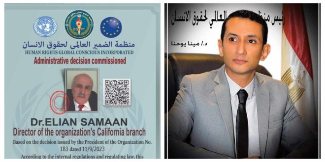 إعتمد الدكتور مينا يوحنا رئيس منظمة الضمير العالمى لحقوق الإنسان أوراق الدكتور الين سمعان ليكون مديرا لفرع المنظمة بولاية كاليفورنيا الأمريكية.