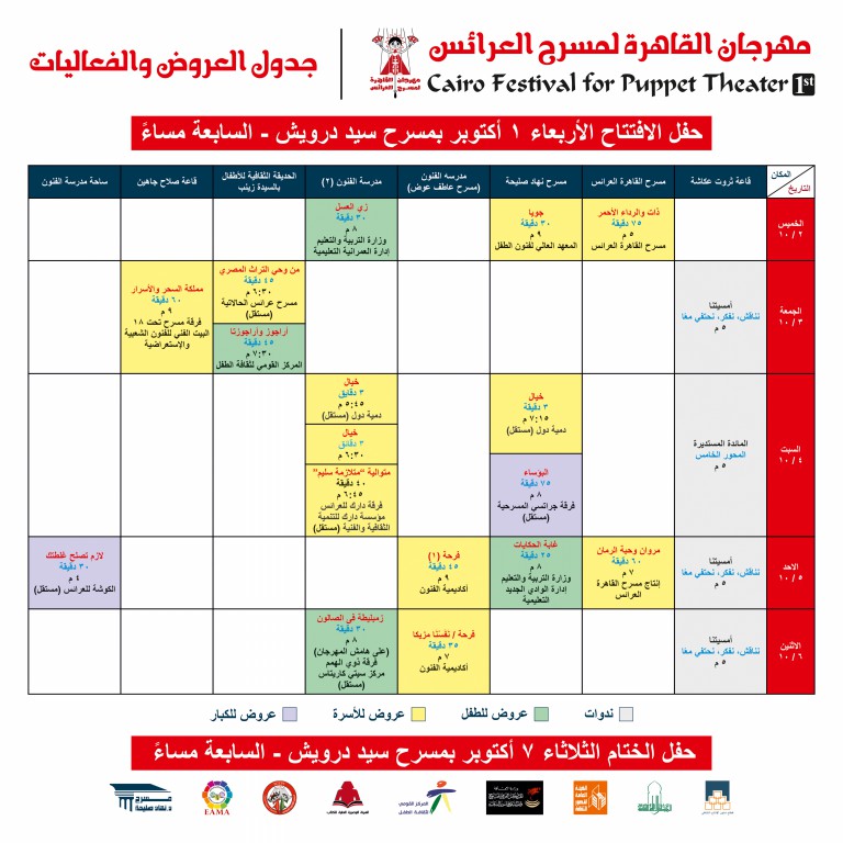 حيث سيبدأ المهرجان رسميا بافتتاح «معرض فنون العرائس» ثم حفل الافتتاح المقرر له الأول من أكتوبر المقبل الساعة 7 مساء على مسرح سيد درويش بالهرم ثم تنطلق فعاليات المهرجان بالترتيب التالي: