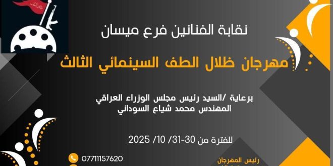 أعلنت نقابة الفنانين العراقيين فرع ميسان : عن موعد انطلاق مهرجان ظلال الطف السينمائي الدولي بنسخته الثالثة ( دورة الفنان الرائد مكي حداد سعيد ) , برعاية دولة رئيس الوزراء الاستاذ المهندس محمد شياع السوداني من يوم 10/30 إلى يوم 1/ 11 / 2025 بمشاركة عربية ودولية على قاعة فندق كورميك .
