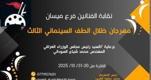 ميسان / كواكب علي السراي أعلنت نقابة الفنانين العراقيين فرع ميسان : عن موعد انطلاق مهرجان ظلال الطف السينمائي الدولي بنسخته الثالثة ( دورة الفنان الرائد مكي حداد سعيد ) , برعاية دولة رئيس الوزراء الاستاذ المهندس محمد شياع السوداني من يوم 10/30 إلى يوم 1/ 11 …